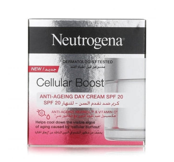 إنّ الكريم النهاري Cellular Boost الذي يعزز الخلايا والمقاوم للشخوخة بوقاية SPF20 من نيوتروجينا غني بالفيتامين ""س"" الذي يعمل على توحيد لون بشرتك وتقليل البقع السوداء. يحتوي الكريم أيضًا على فلاتر للحماية من الأشعة فوق البنفسجية الطويلة والمتوسطة (UVA/UVB) فتحمي بشرتك من أشعة الشمس الضارّة.
