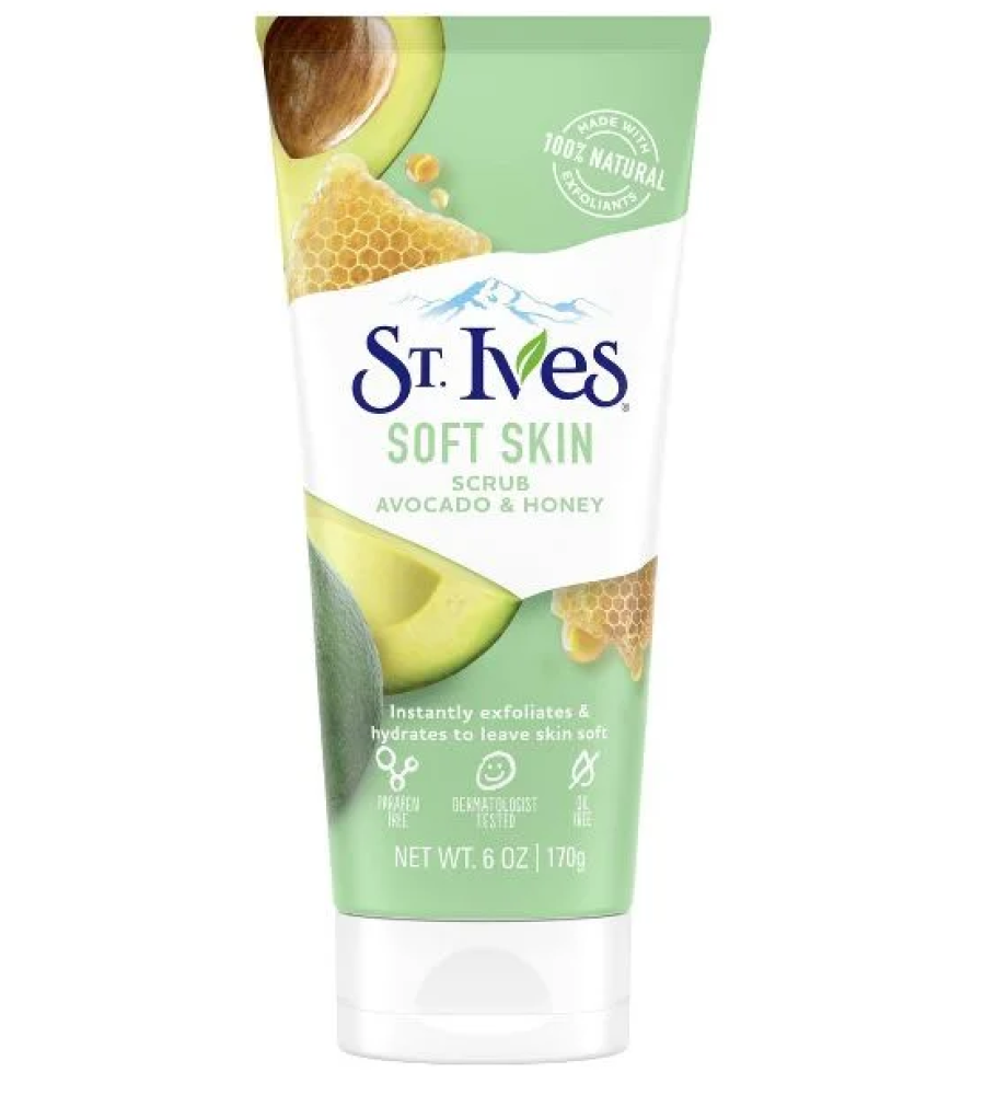 St. Ives Soft Skin Scrub Avocado & Honey 170g A soft facial scrub with avocado and honey. Avocado butter is known for its moisturizing properties, and honey is known to nourish. Made with 100% natural exfoliants, this delicious scrub banishes dryness to reveal soft, even skin.